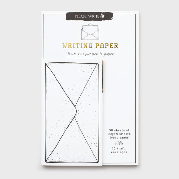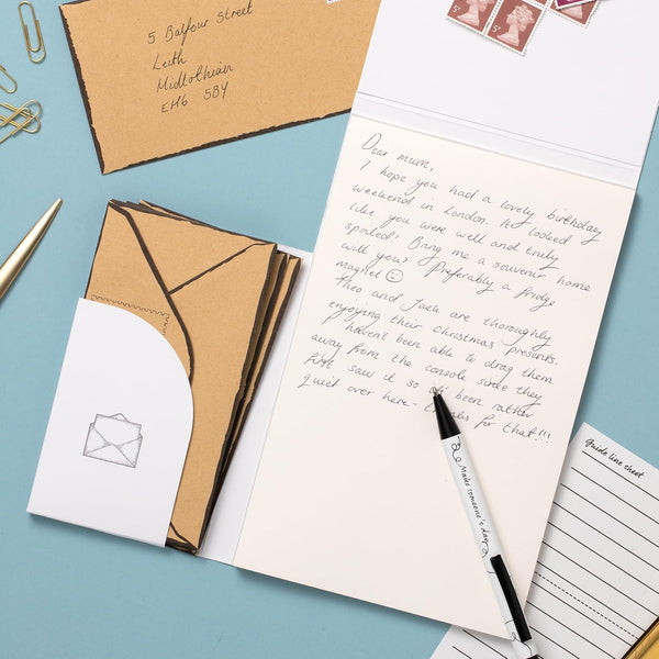 Something to write? A modern version of a traditional writing pad with envelopes. Pause and put pen to paper with this lovely hard backed writing pad. Devote some of your precious time to writing to someone who would love to receive a letter from you. This (traditional in format) writing paper pad is illustrated beautifully and contains 30 sheets of 100gsm smooth ivory paper, making the writing experience even more pleasurable. The clever packaging has a magnetic front pocket holding 10 printed Kraft envelopes in precisely the correct size and shape to take your letter.